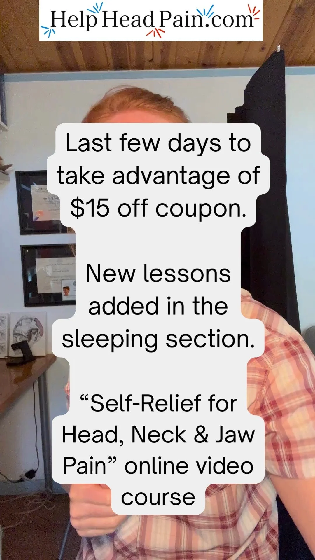 In order to help more people experiencing headaches, neck or jaw pain I developed two online, learn-at-your-own-pace video courses with my second business of Help Head Pain. For my hands on headache and TMJD clients I reference it for your homework to achieve and maintain muscular relief. Try a free teaching video by signing up below.